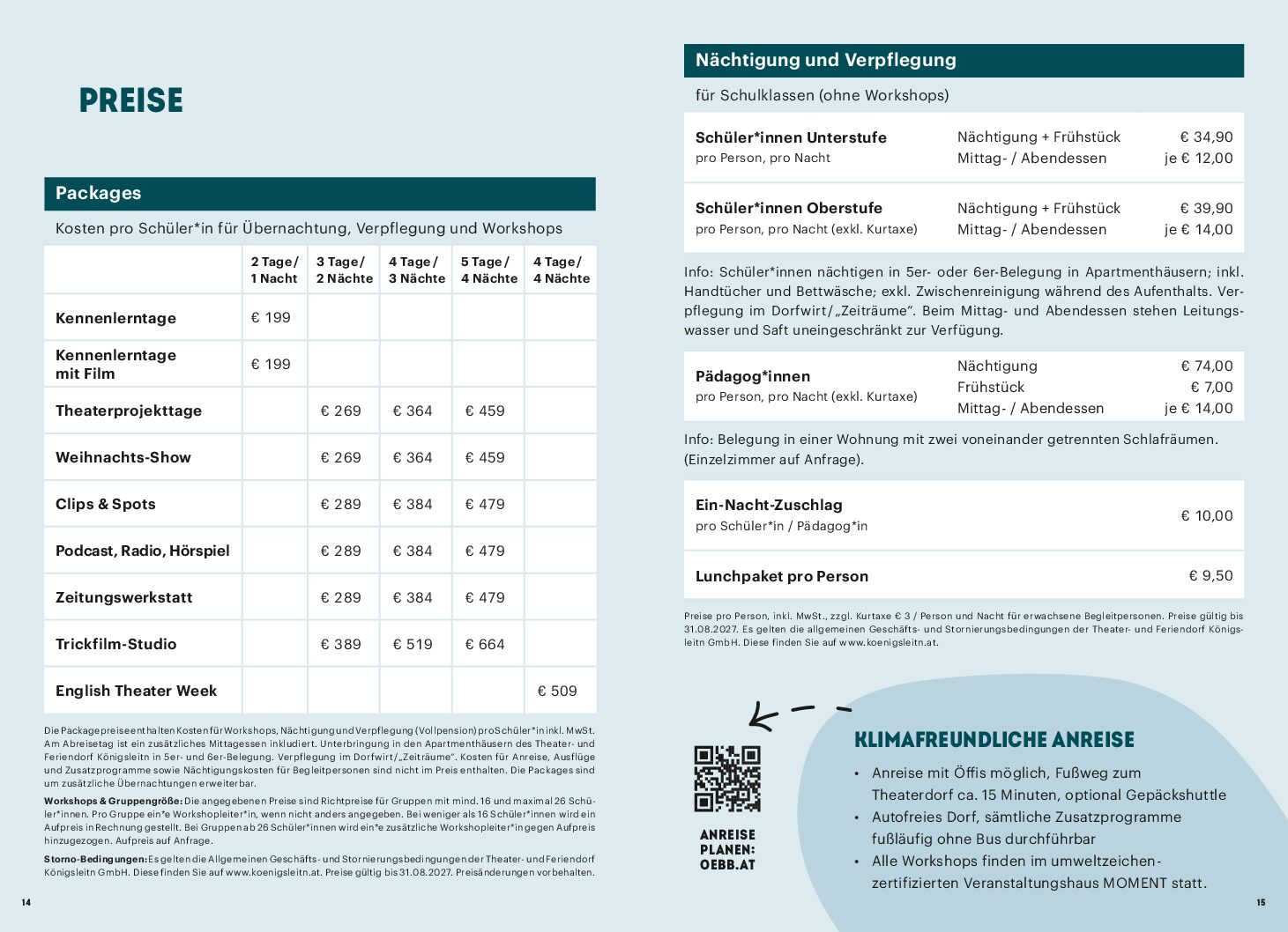 Die Packagepreise enthalten Kosten für Workshops, Nächtigung und Verpflegung (Vollpension) pro Schüler*in inkl. MwSt. Am Abreisetag ist ein zusätzliches Mittagessen inkludiert. Unterbringung in den Apartmenthäusern des Theater- und Feriendorf Königsleitn in 5er- und 6er-Belegung. Verpflegung im Dorfwirt / „Zeiträume“. Kosten für Anreise, Ausflüge und Zusatzprogramme sowie Nächtigungskosten für Begleitpersonen sind nicht im Preis enthalten. Die Packages sind um weitere Übernachtungen erweiterbar.